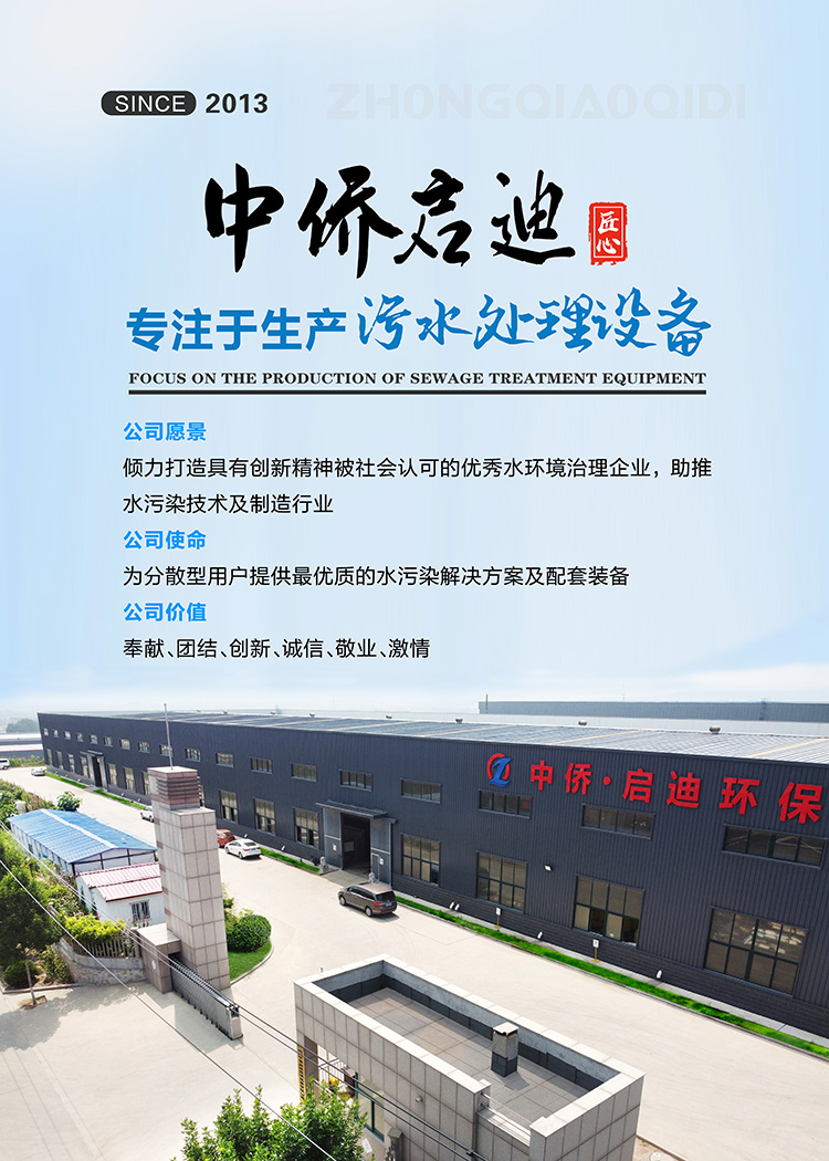 “專一專業(yè)轉(zhuǎn)于環(huán)保,專心專注專于污水”,我們對(duì)每一個(gè)項(xiàng)目都深入詳盡,在調(diào)查研究的基礎(chǔ)上,結(jié)合項(xiàng)目實(shí)際情況,采用技術(shù)上先進(jìn)、經(jīng)濟(jì)上節(jié)約的工藝設(shè)計(jì)處理方法。在生產(chǎn)及施工過程中,嚴(yán)格按設(shè)計(jì)要求來控制質(zhì)量,用心贏得客戶認(rèn)可和信任。中僑啟迪奉行“質(zhì)量立企,誠信為本”的企業(yè)精神,以精品開拓市場(chǎng)、誠信服務(wù)客戶努力創(chuàng)造更加燦爛輝煌的未來。