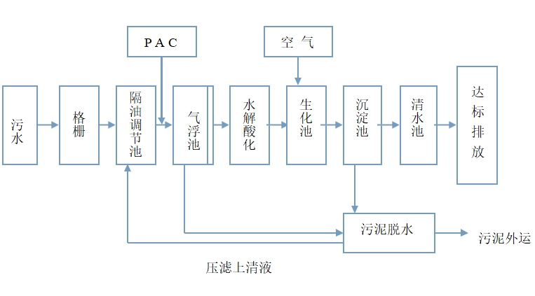 經(jīng)過技術(shù)部討論分析,結(jié)合我公司多年來對污水處理的經(jīng)驗(yàn),本方案擬采用格柵+隔油調(diào)節(jié)池+氣浮+ 水解酸化+生物一體化工藝,該工藝具有技術(shù)成熟、效果穩(wěn)定、污染物去除徹底、操作方便、運(yùn)行靈活等優(yōu)點(diǎn)。具體工藝流程如下: