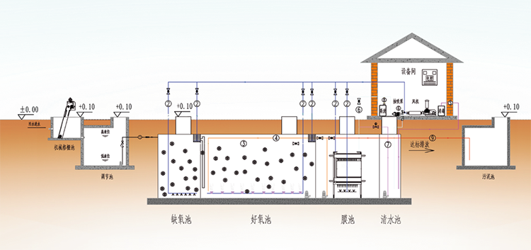 模塊設(shè)計(jì):采用獨(dú)特的外觀及高度集成模塊化設(shè)計(jì),可以根據(jù)實(shí)際情況將缺氧池、膜池及控制室分開(kāi)設(shè)計(jì)和安裝,便于運(yùn)輸。