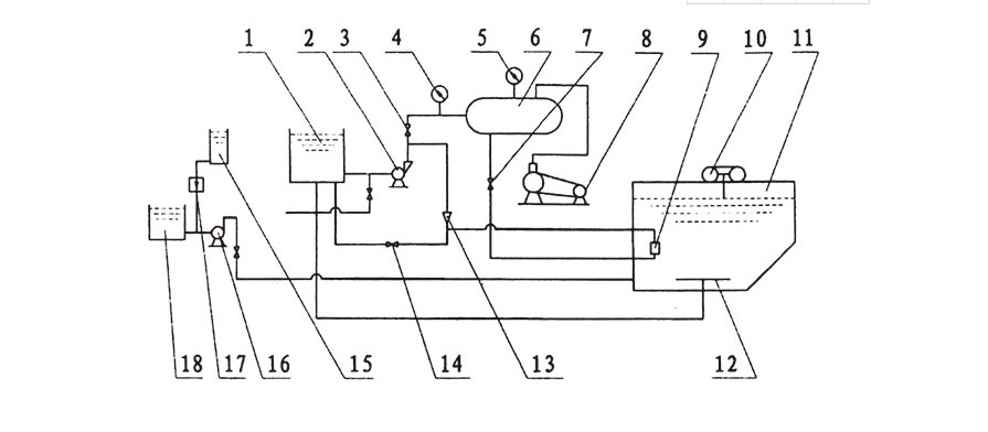 經(jīng)加藥反應(yīng)后的污水進(jìn)入氣浮機(jī)的混合區(qū)。與釋放后的溶氣水混合接觸,使絮體粘附在細(xì)微氣泡上,然后進(jìn)入氣浮區(qū),絮凝體在氣浮力的作用下浮向水面形成浮渣,下層的清水經(jīng)集水器流至清水池后,一部分回流作溶氣水使用,剩余清水通過溢流口流出。氣浮池水面上的浮渣聚集到一定厚度以后,由刮沫機(jī)刮入氣浮機(jī)污泥池后排出。