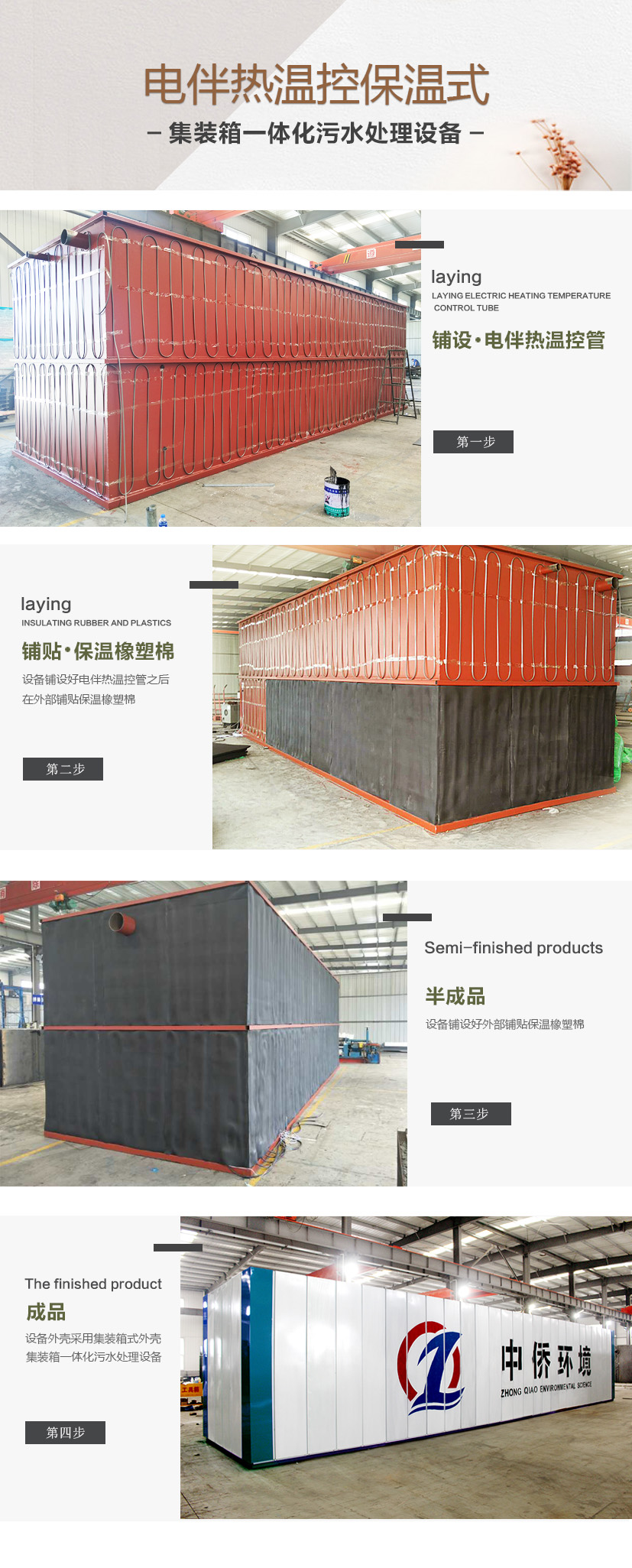 電伴熱溫控集裝箱一體化污水處理設備從根本上解決了北方冬天寒冷的氣溫,設備美觀、大氣、上檔次,可以放在地面以上。