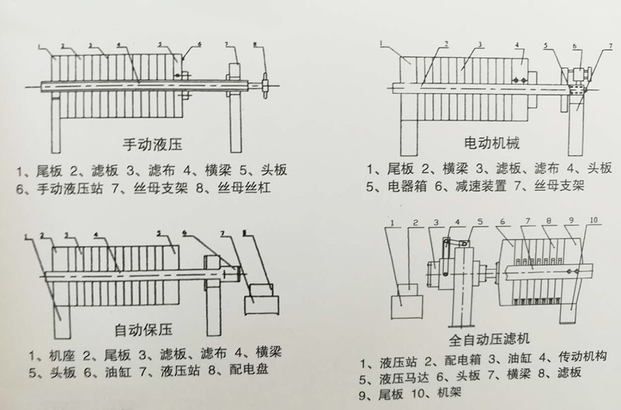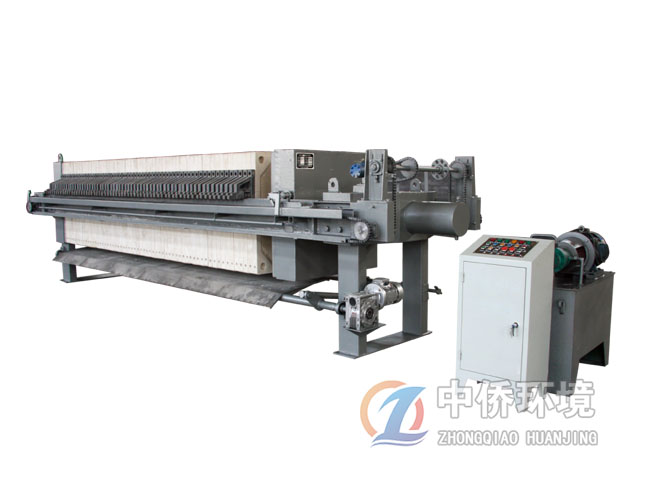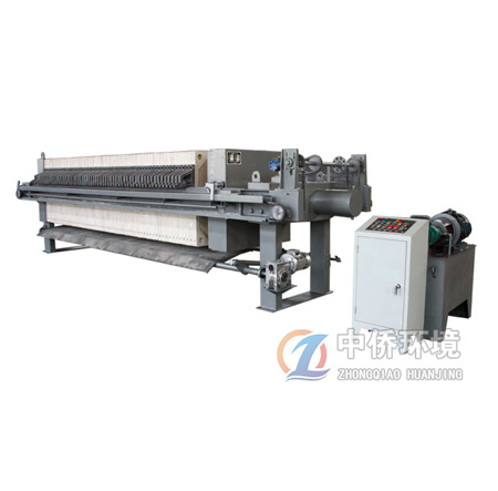 啟動(dòng)電機(jī),通過減速機(jī)帶動(dòng)絲桿轉(zhuǎn)動(dòng)推動(dòng)頭板移動(dòng),壓緊濾板,然后用鎖緊螺母鎖緊。用泵將帶過濾的懸浮液輸送至已壓緊的各個(gè)濾室中,懸浮液中的液體透過濾布,通過各濾板上的濾液孔排至機(jī)外,懸浮液中的固體顆粒積聚于濾室中,逐漸形成濾餅,濾餅充滿濾室,即完成一個(gè)過濾循環(huán)。如使用雙隔膜濾板,可在進(jìn)料結(jié)束后,向橡膠模內(nèi)通入壓縮空氣,使隔膜鼓脹,壓榨濾餅,使濾 餅內(nèi)水分進(jìn)一步溢出。